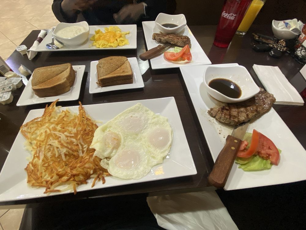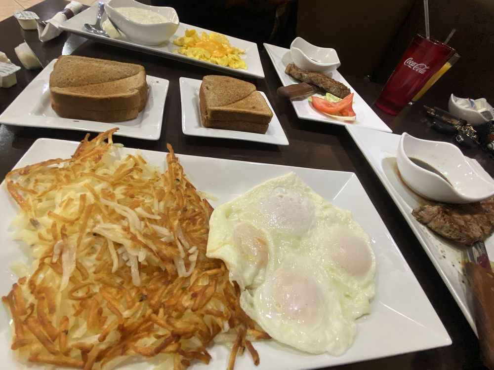 3 eggs, any style, a split biscuit with sausage gravy, and home fries or grits.